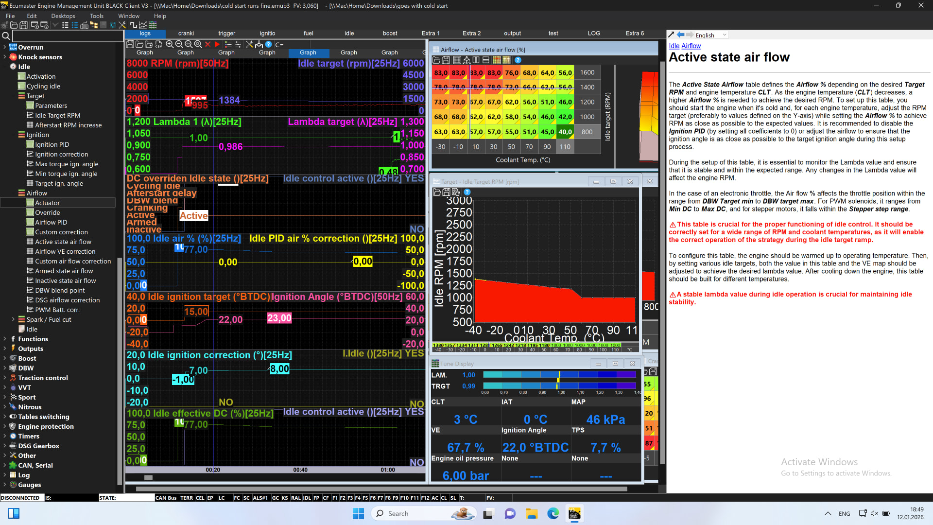 Increase the Idle >> Active State Airflow so that Idle RPM reach the Idle Target. You can see that your Idle RPM can’t reach the target in the log for the cold part of the warmup.