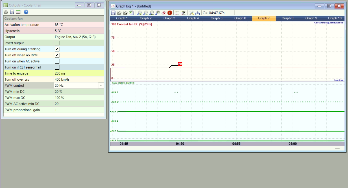 How ever as you can see on these last 2 pictures I posted, when turning Coolant Fan strategy off and setting up the same in PWM #1 table, ticking the box āDisable when no RPMā it shuts off output and AUX 2 is not active.